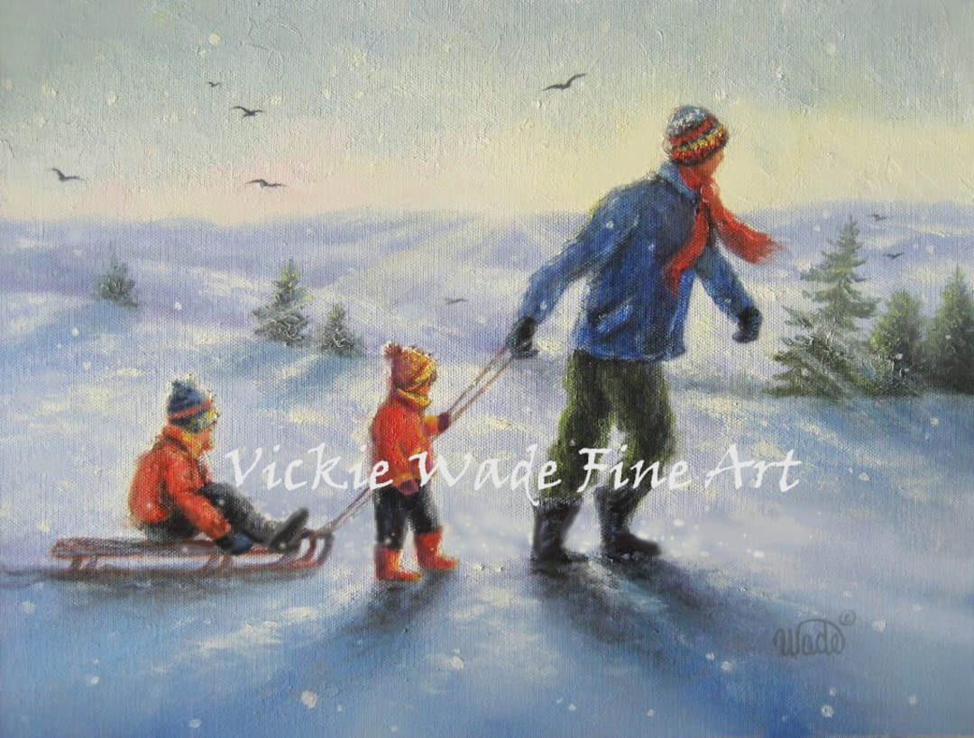 Sledding With Dad Art Print Brother Sister Boy Girl Playing Etsy